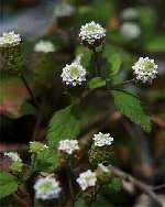LIPPIA DULEIS (Lippia dulcis) Mexican herb used since at least the time of the Aztecs for coughs, colds, bronchitis, asthma, and colic. Leaves contain the intensely sweet compound hernandulcin (1000 times sweeter than sugar) but high camphor content makes them unsuitable for use as a sugar substitute. Fast growing, low creeper, with small white flowers; excellent in hanging baskets.